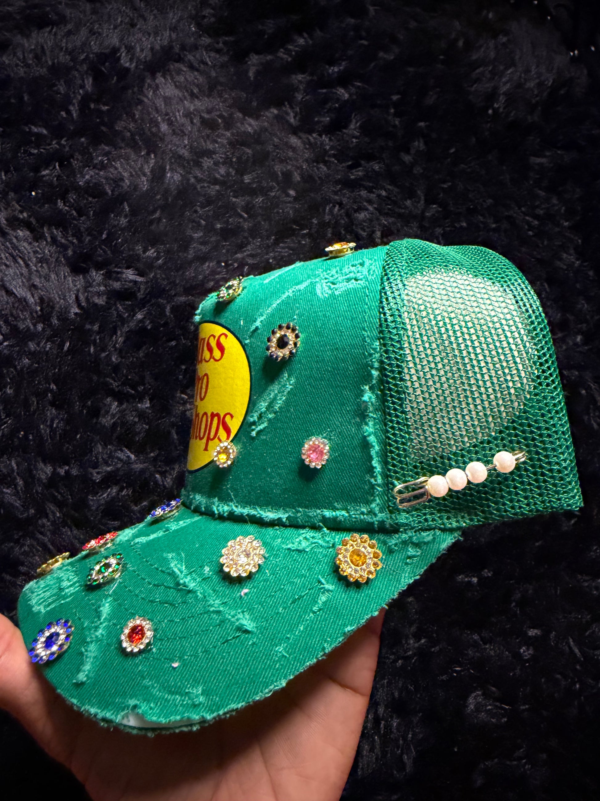 Green Distressed Trucker W Gems